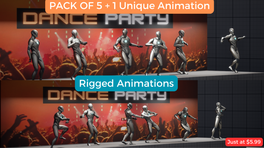Hey Developer Are You Looking for Some Quick Dancing Animations For Your Unreal Engine Project, here is a Pack of 6 Unique Animations Rigged to Unreal Engine 5 Skeletons Manny and Quinn, Designed and meticulously retargeted for seamless integration, this animation pack will elevate your game or project to a whole new level. Whether you're developing a game, virtual production, or architectural visualization, these animations will bring life and character to your creations like never before.